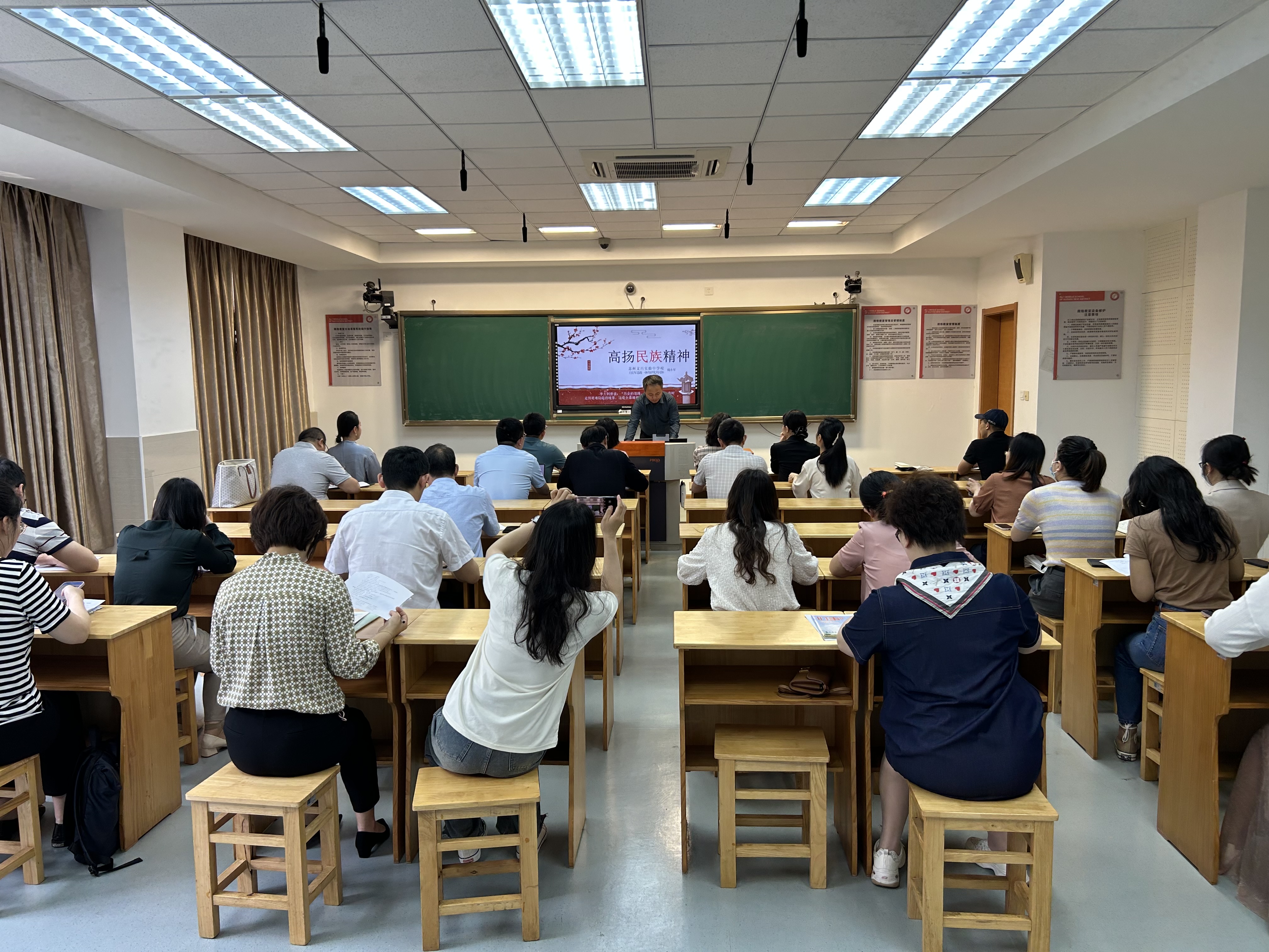江苏省大中小学思政课一体化建设专家指导委员会委员、高新区中学政治教研员王庆军作了《升维木樨花思政 打造区域思政一体化大格局》专题讲座。苏州高新区先行先试,以“木樨花思政项目”为抓手,不断健全“区域联动机制”“专家引领机制”“联合教研机制”和“协同创新机制”,形成了在全省有一定影响力的“一核八面”区域一体化大思政新格局。高新区一中学校党委书记王新民,党委副书记、校长杜颜,副校长章洁,高新区思政一体化教育联盟专家指导委员会部分委员、一线教师代表近40人参与了座谈交流。