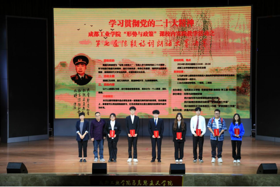 5月8日晚上七点,成都工业学院长虹会堂座无虚席,掌声雷动,第七届陈毅诗词朗诵大赛决赛如期举行。大赛由马克思主义学院、党委宣传部、教务处、学工部、校团委主办,形势与政策教研室、四川省形势与政策课程虚拟教研室、四川省高校思政课“罗英名师工作室”、四川省教科文卫体系统五一巾帼“罗英创新工作室”承办,求是共进社协办。校党委常委、党委宣传部部长常淑丽,马克思主义学院副院长邓若玉,校团委老师章为,马克思主义学院教授粟深蓉,马克思主义学院副教授王志伟、罗玉洁,求是共进社学生代表张锐悦同学受邀出席并担任评委。全校500余名学生代表现场观看了决赛。
