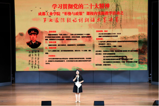 陈毅元帅是成都工业学院杰出的校友,陈毅精神是学院独特的红色资源,学习陈毅精神,传承红色基因,是该校的优秀传统。打造具有亲和力的实践教学是成都工业学院国家级一流课程“形势与政策”课的特色,是省名师工作室、省创新工作室、省虚拟教研室践行“实践育人、文化育人”的有效举措。目前成都工业学院已连续举办七届陈毅诗词朗诵大赛,让同学们以不同形式学习感悟陈毅精神,追忆元帅风采,传播红色文化,真正在实践中落实立德树人的根本任务。