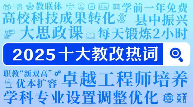 2025年是贯彻全国教育大会精神、落实教育强国建设规划纲要的关键之年。教育部贯彻落实党中央、国务院决策部署,制定实施教育强国建设三年行动计划,启动三年行动计划综合改革试点,以小切口带动全局性改革,加快推动教育强国建设从谋划转向实干。一年来,两批次六大类41项试点落地见效,呈现出以试点探索、精准突破带动改革纵深推进、形成协同发力的良好态势,教育强国建设迈出坚实步伐。跟教育小微一起了解2025十大教改热词——