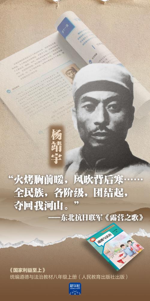 “全民族,各阶级,团结起,夺回我河山”“未惜头颅新故国,甘将热血沃中华”“军人战死沙场原是本分,没有什么值得悲伤的”……1945年8月15日,日本无条件投降。80年后的今天,让我们跟着课本,一起缅怀抗日英雄,重温他们震天撼地的壮烈事迹。