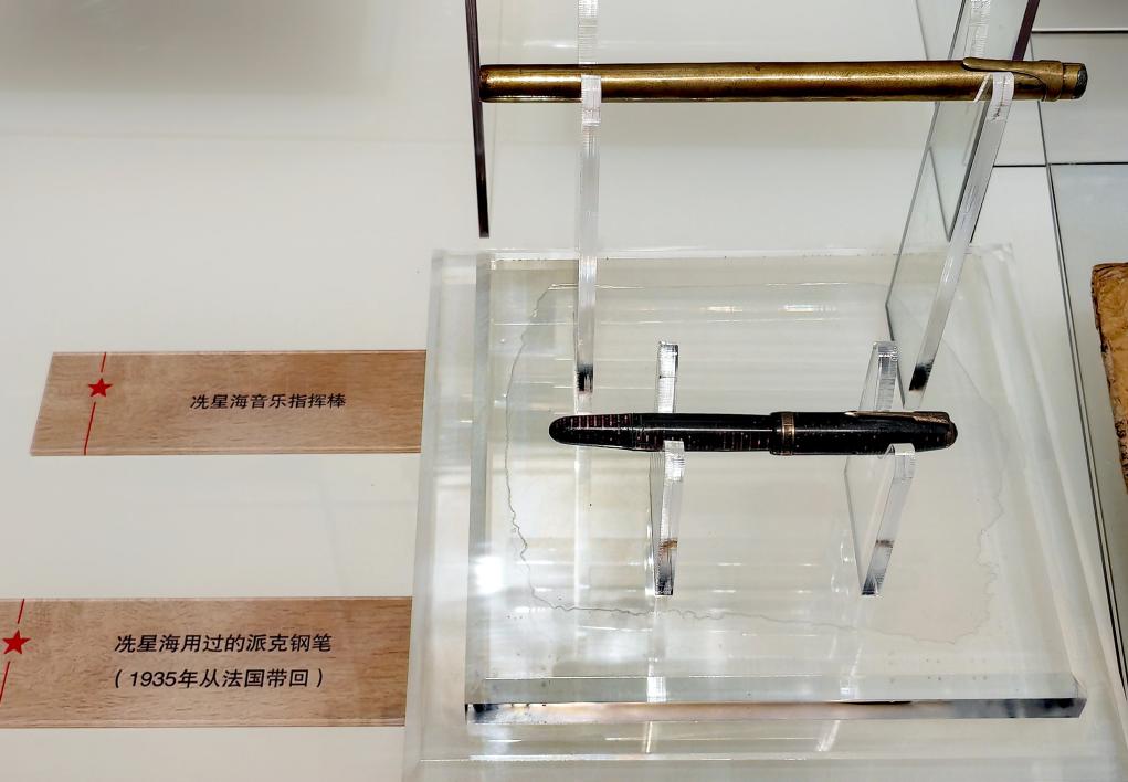 延安文艺纪念馆展出的冼星海使用过的指挥棒和钢笔。新华社记者 孙正好 摄