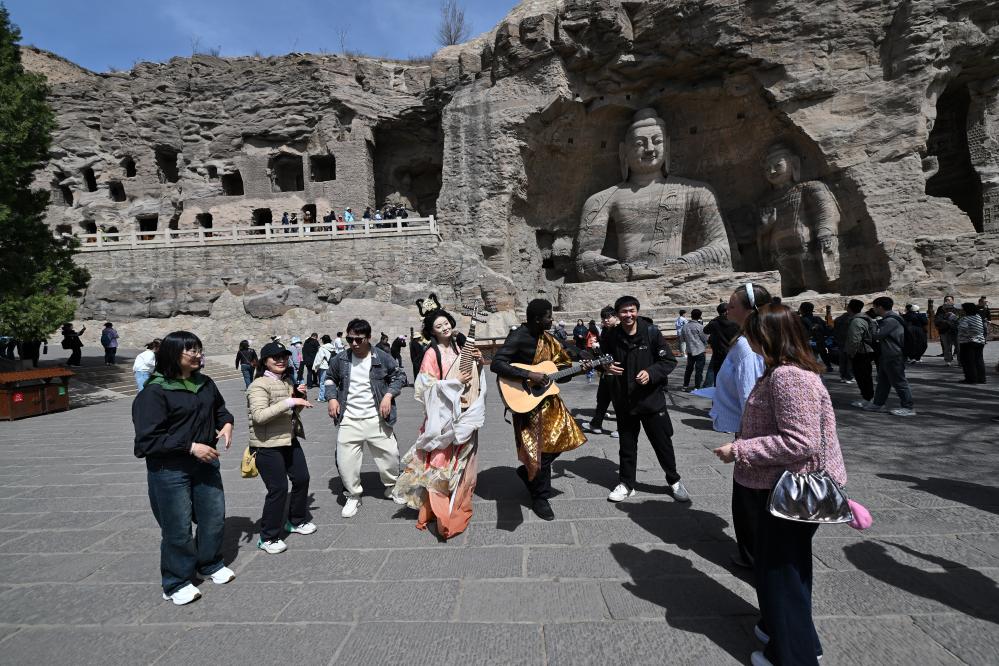 2025年4月15日,在云冈石窟,身着传统服装的演员和游客互动。新华社记者 詹彦 摄