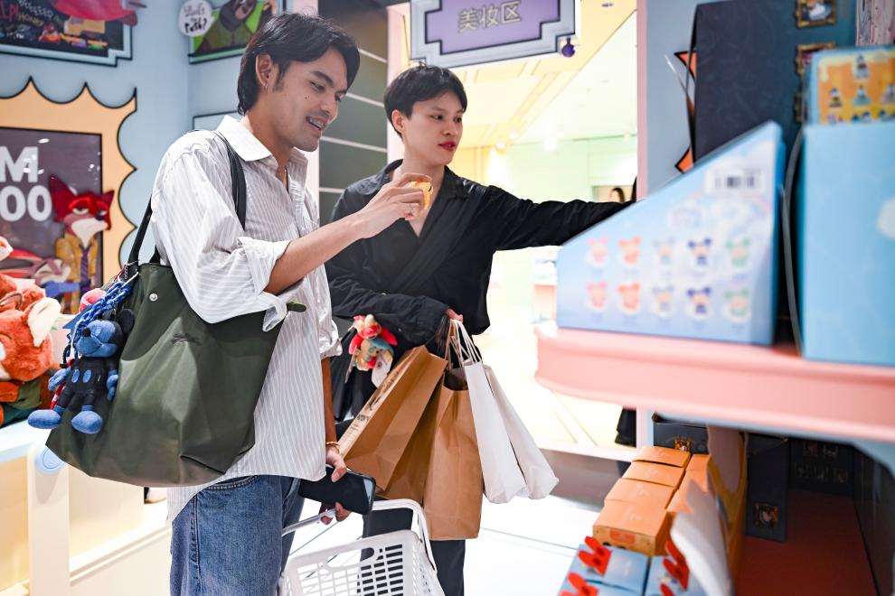 2025年7月17日,两名泰国游客在位于上海市南京路步行街的一家潮玩店里挑选商品。新华社记者 陈浩明 摄