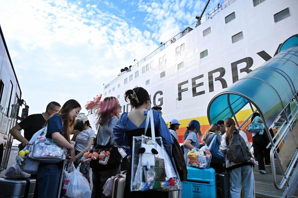 2025年10月1日,在青岛邮轮母港码头,旅客登上客货班轮“新金桥5号”。新华社记者 李紫恒 摄