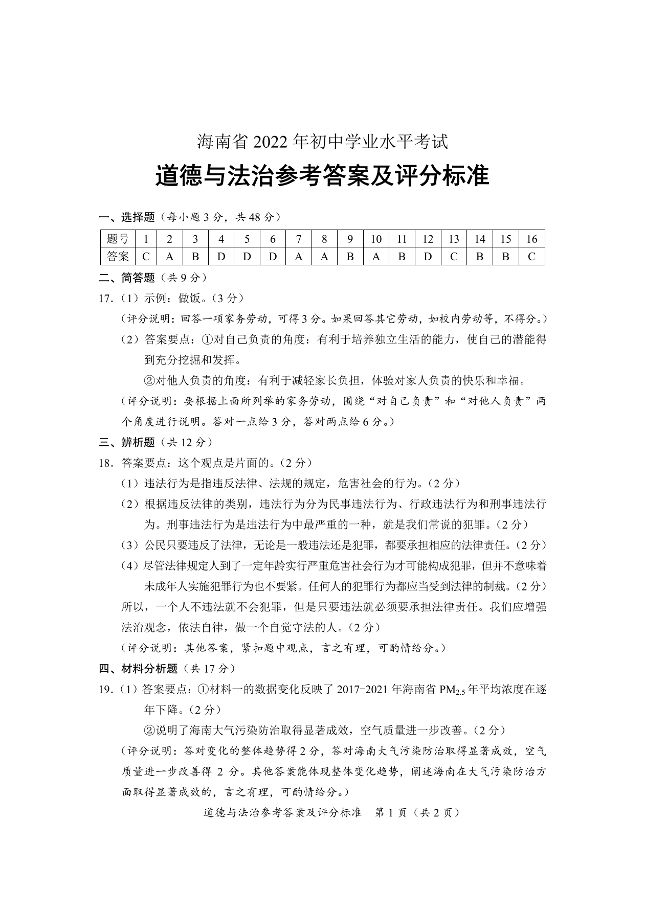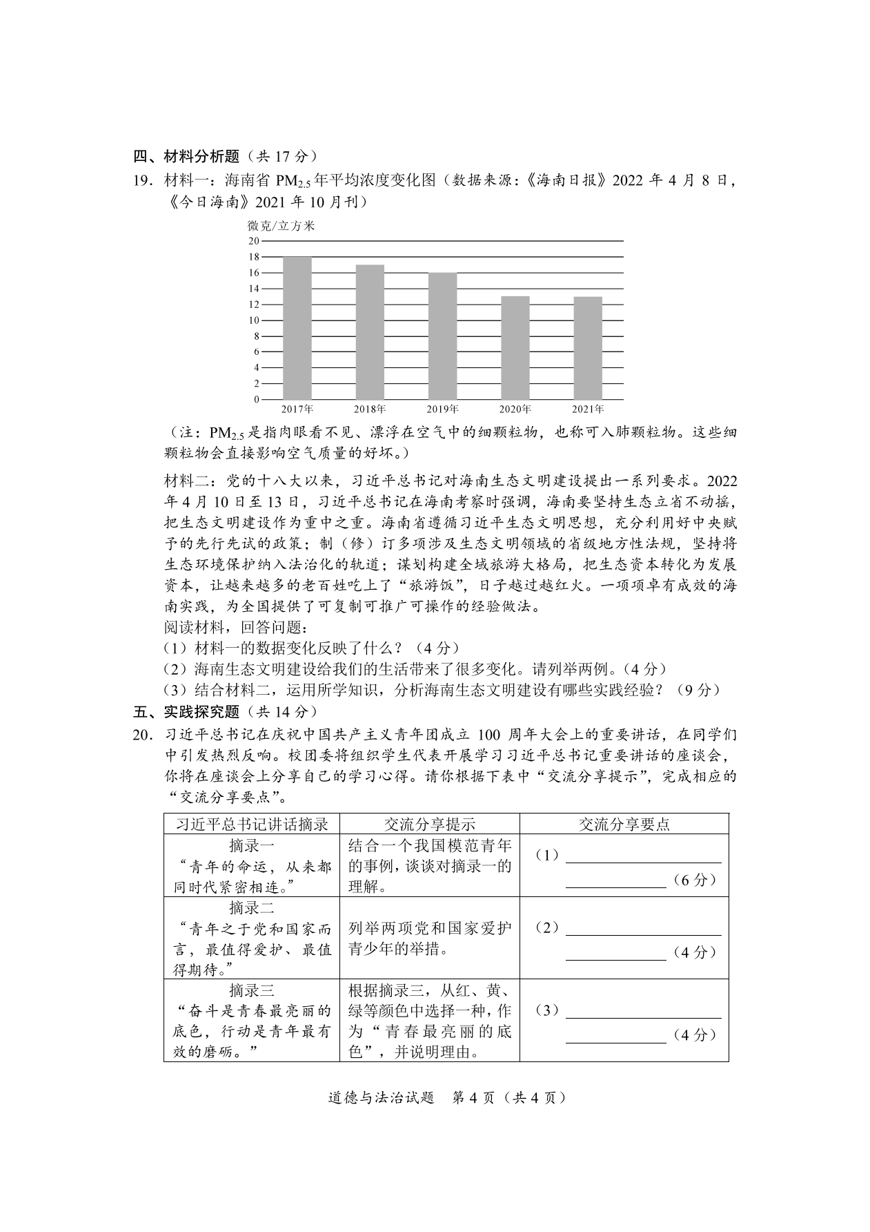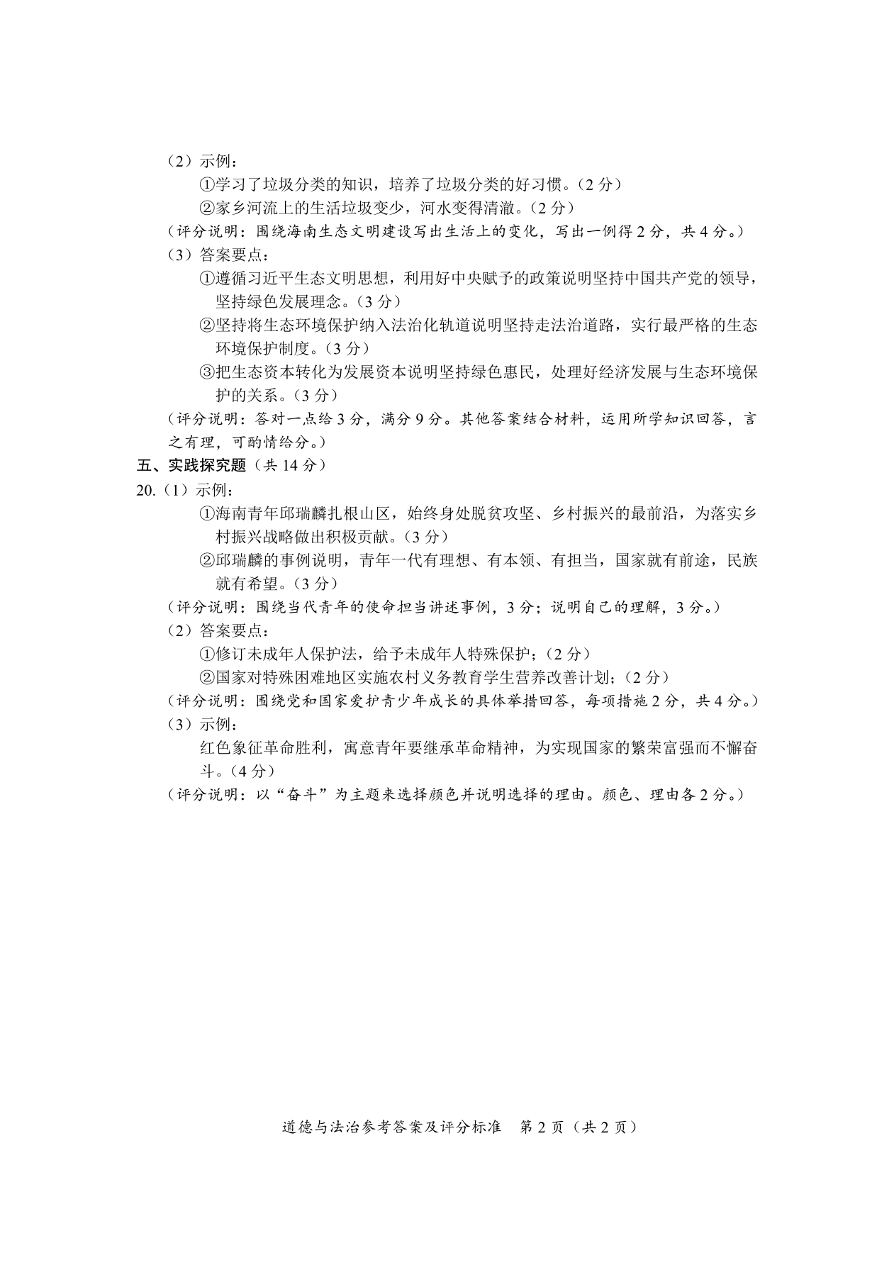海南省2022年初中学业水平考试道德与法治试题、参考答案及评分参考