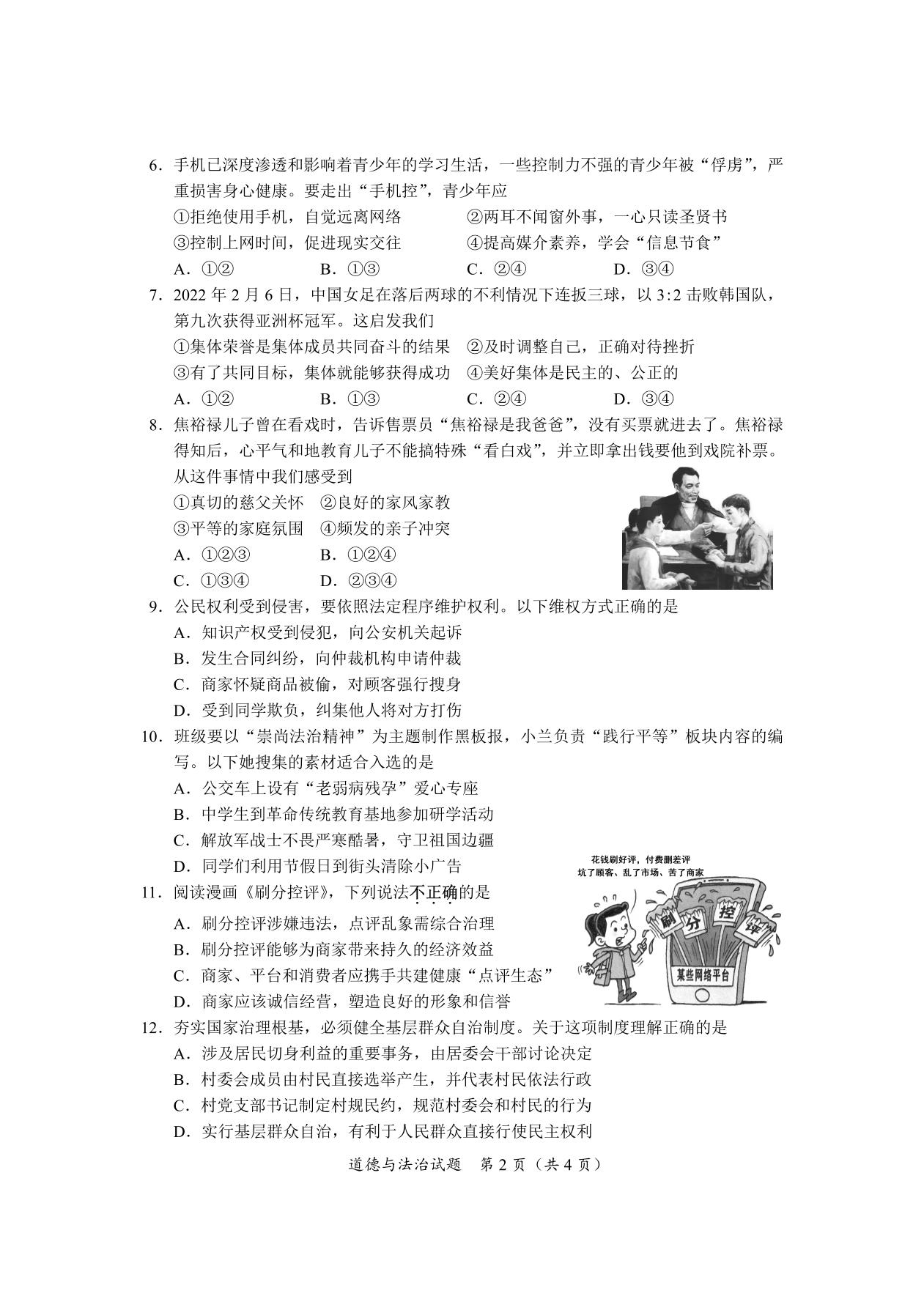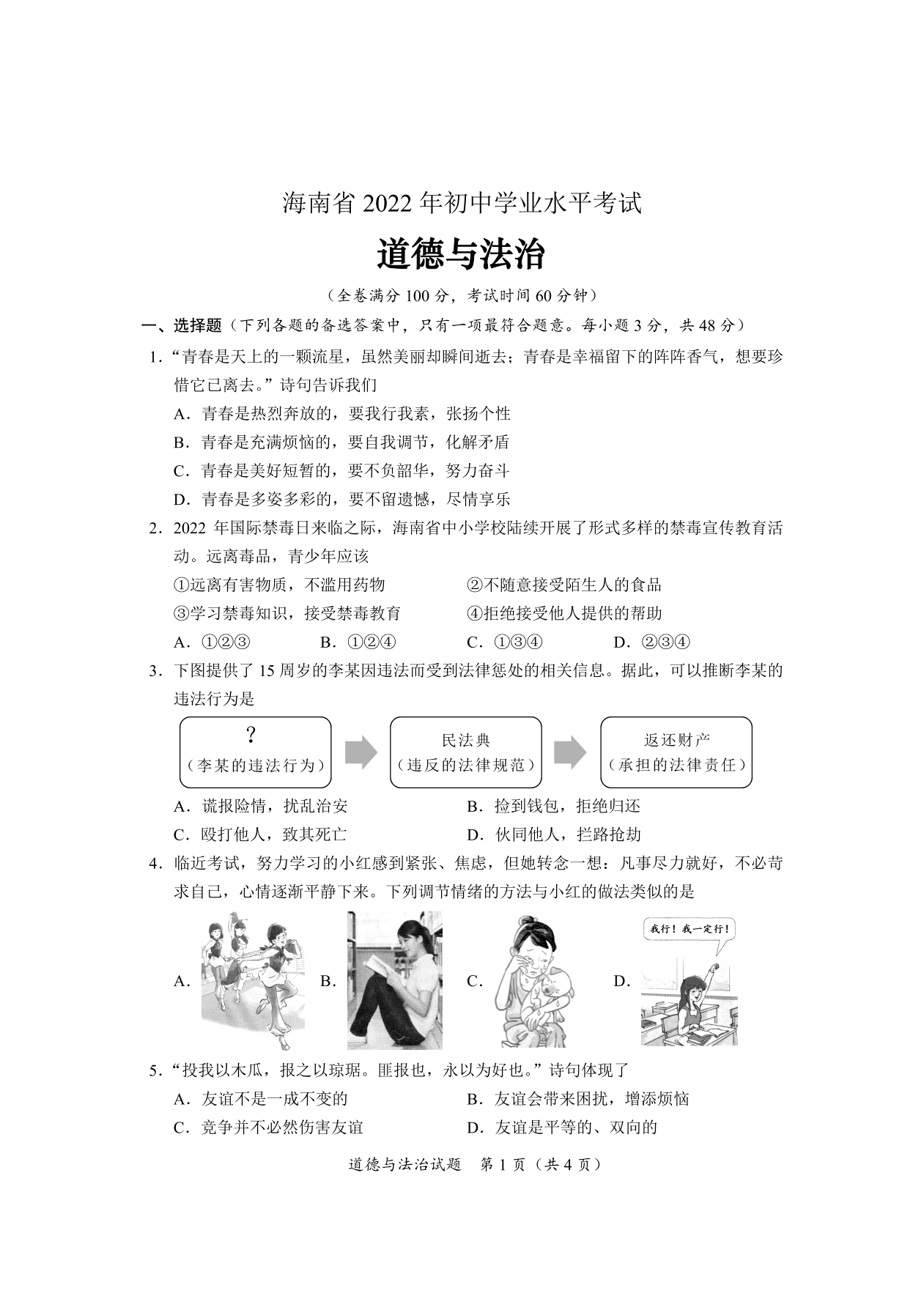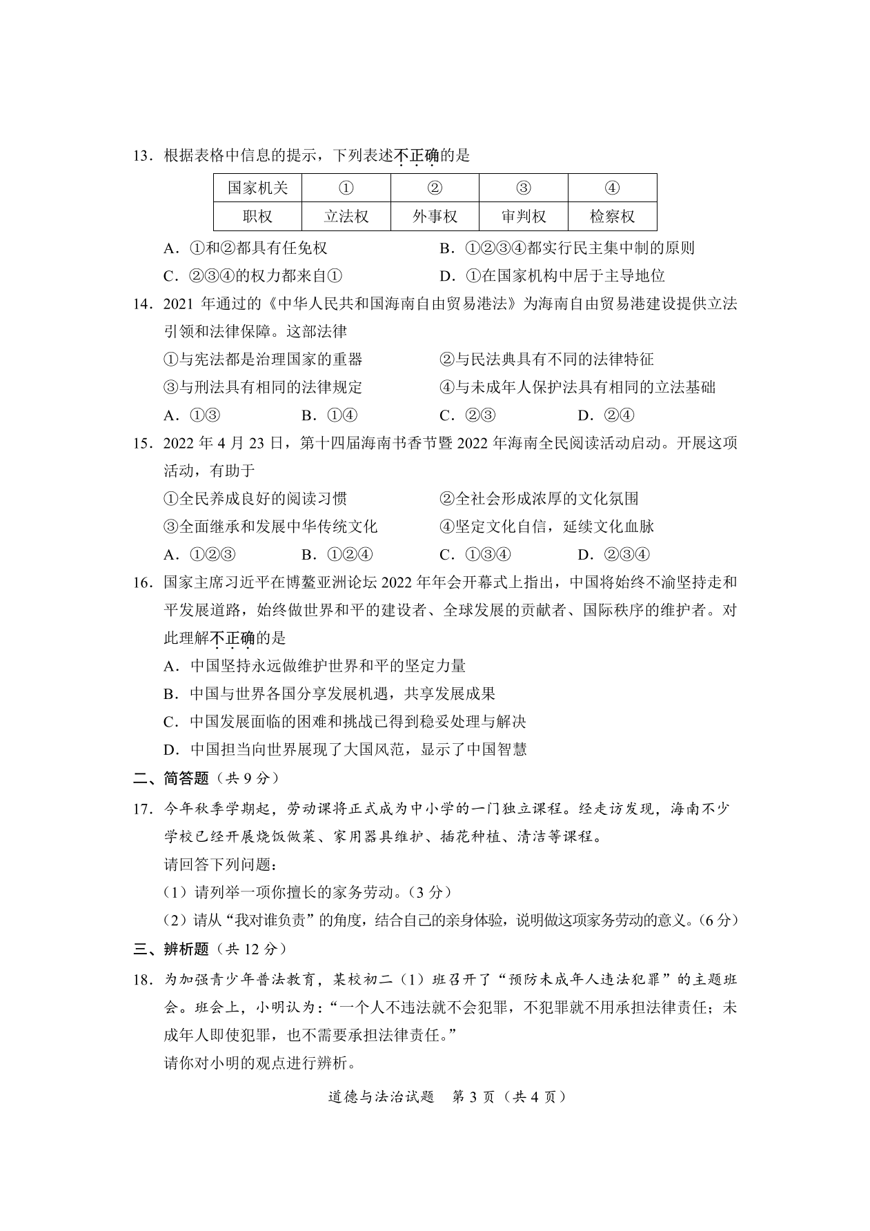 海南省2022年初中学业水平考试道德与法治试题、参考答案及评分参考