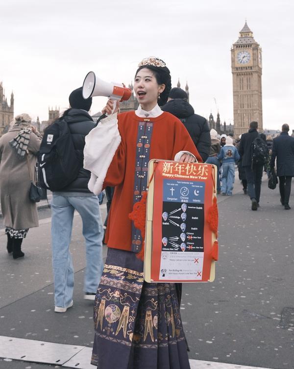 江西女生曹梦竹毕业于爱丁堡大学,在硕士入学前,她正在度过自己的间隔年,在社交媒体上分享着留学生活的点滴日常。得知申遗成功的消息,她从摄影师朋友那里借来一身红色的明制汉服,带着扩音器、妈妈编织的中国结和春节文化的宣传板,来到人山人海的伦敦眼、大本钟下,“来自世界各地的朋友都会在那儿打卡”。
