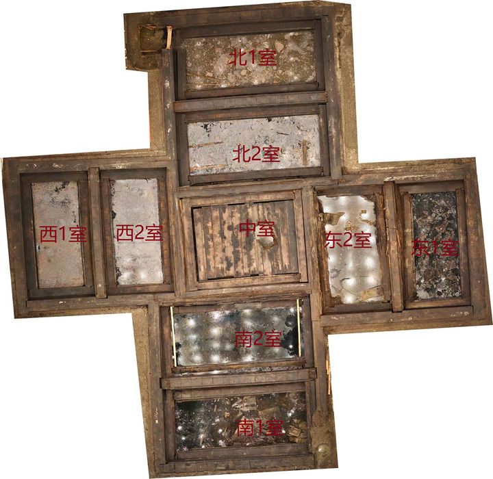 武王墩考古项目负责人宫希成表示,不同椁室数量对应墓主生前身份等级,楚王级别的九室墓尚属首次发现。书写于木椁上的墨书文字则记载了椁盖板放置方位和椁室功能分区等内容,犹如整个墓葬的“说明书”,如北一室西墙最下层墙板上的“南乐府、西、咊、一”分别对应着“分室名称、所在方位、木材性质和编号”。