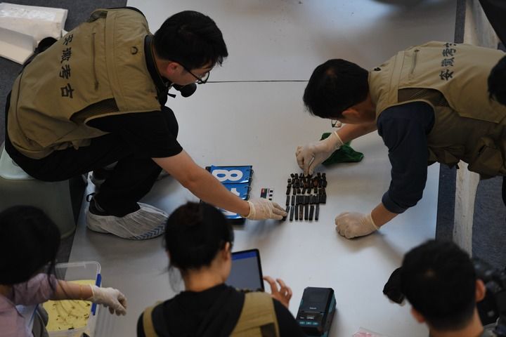 考古人员在安徽淮南武王墩一号墓考古发掘现场清理出土文物(2024年5月20日摄)。新华社记者 张端 摄