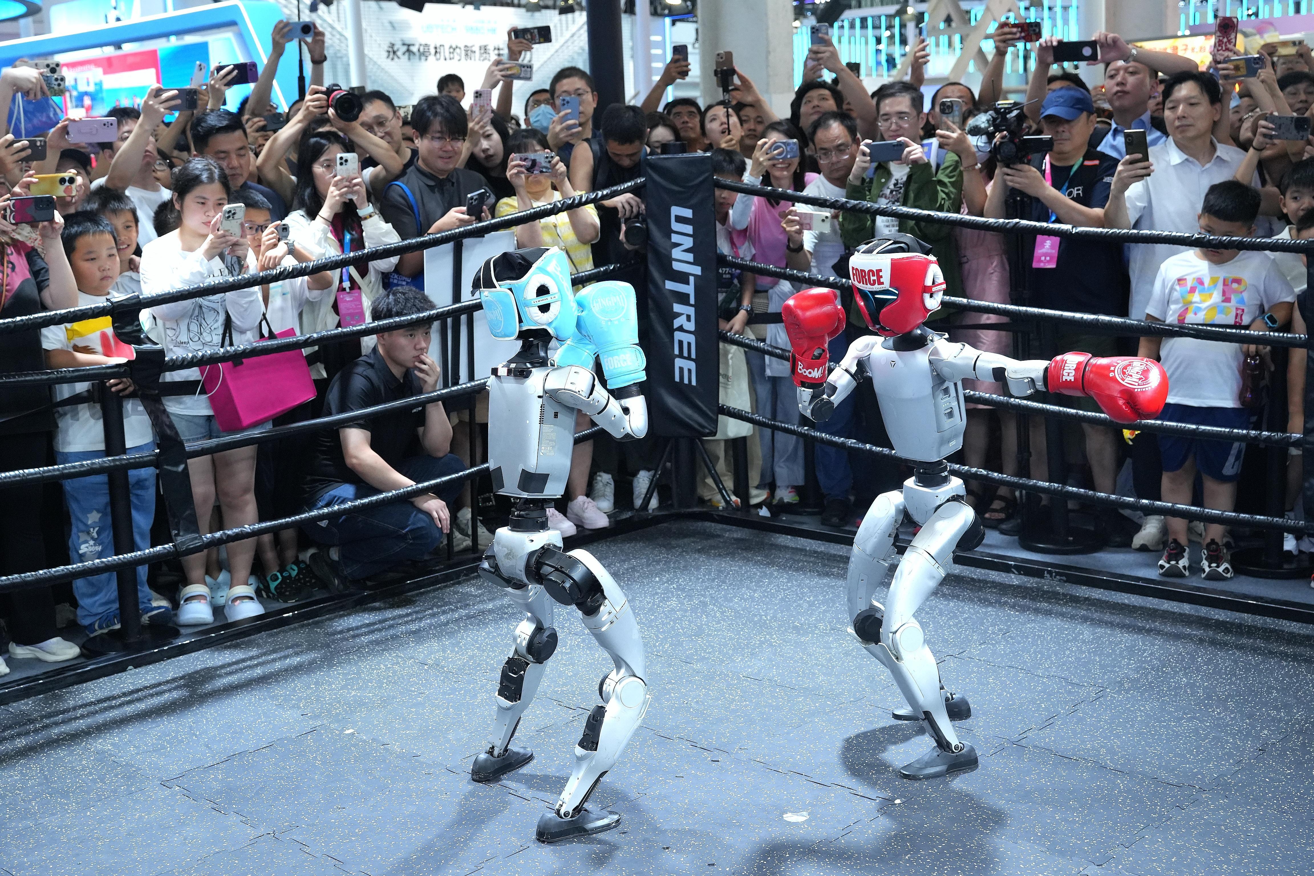 大会现场的技术展示,印证着产业的加速突破。在宇树科技的展台前,红色与蓝色的人形机器人G1,在擂台上展开激烈格斗。只见闪转腾挪间拳脚相接,金属碰撞声清脆作响,引得观众频频喝彩。宇树科技创始人、首席执行官王兴兴指着机器人铝合金腿部的凹坑介绍,机器人在格斗中需完成十几到二十个动作序列的随机组合,既要切换丝滑,又要应对强冲击,这与无干扰表演的技术水平截然不同。“这些痕迹正是抗冲击技术突破的直接证明。”王兴兴说。