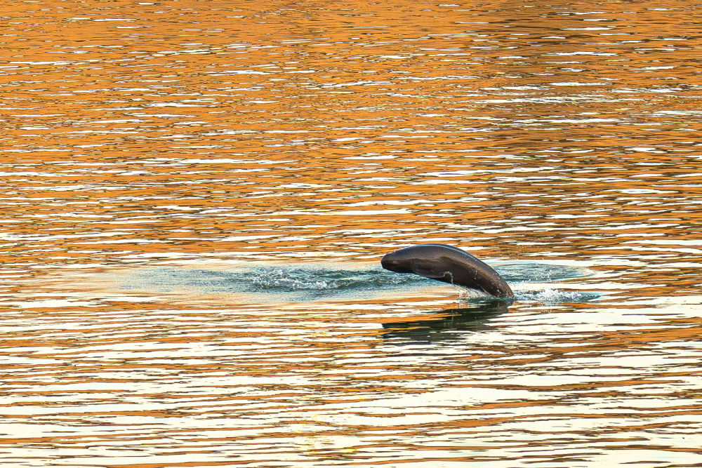 2025年1月5日,长江江豚在长江宜昌葛洲坝下游附近踏浪前行,与浪花共舞。新华社记者 肖艺九 摄