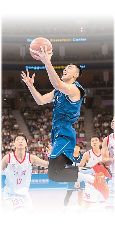 广东队球员胡明轩(上)在篮球男子成年组比赛中突破上篮。新华社记者 李 博摄