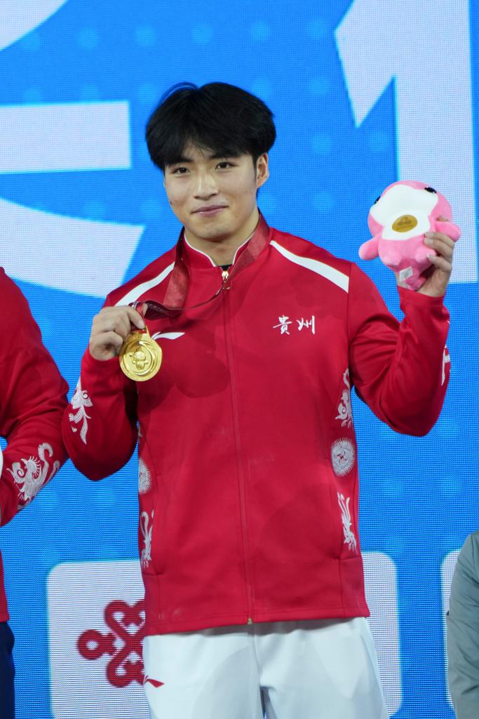 ↑11月18日,获得冠军的贵州队选手雷江清在颁奖仪式上展示金牌,他身上的贵州代表队服装上绣着传统纹饰。新华社记者 杨晨光 摄