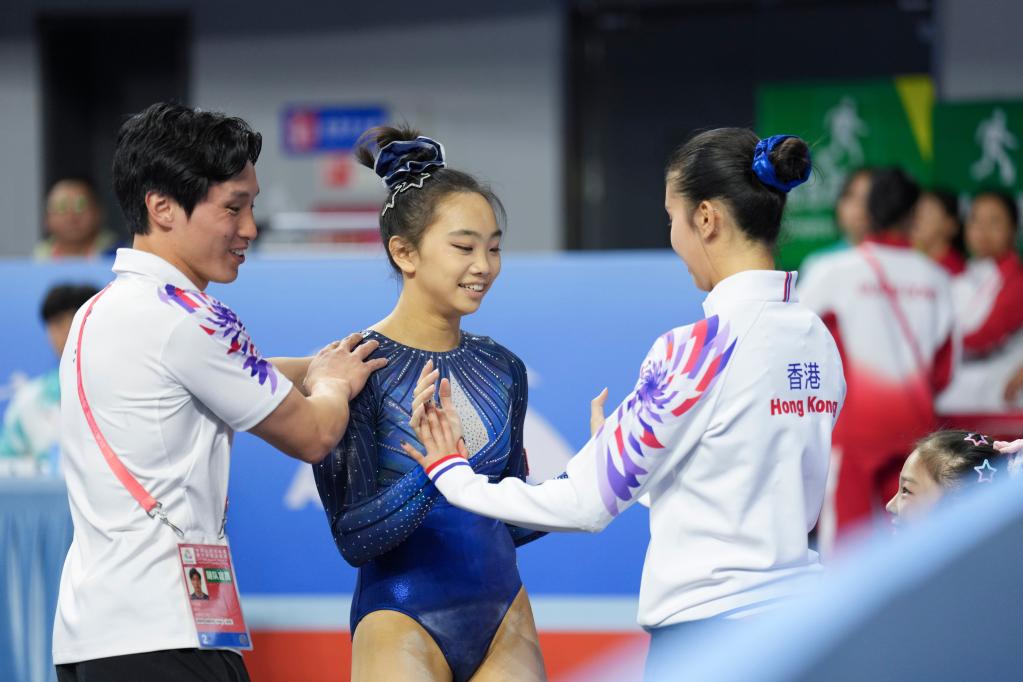↑11月11日,香港队选手曾凯缘(中)在平衡木比赛完赛后与教练(左)、队友一起庆祝。新华社记者 胥冰洁 摄