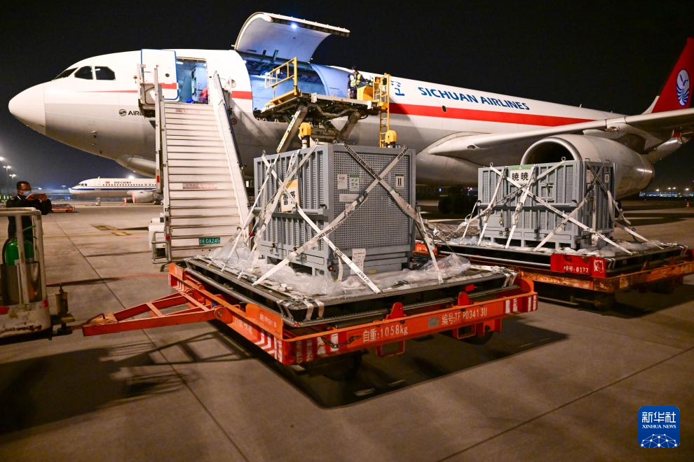 1月28日凌晨,大熊猫“晓晓”“蕾蕾”飞抵成都天府国际机场。新华社发(中国大熊猫保护研究中心供图)