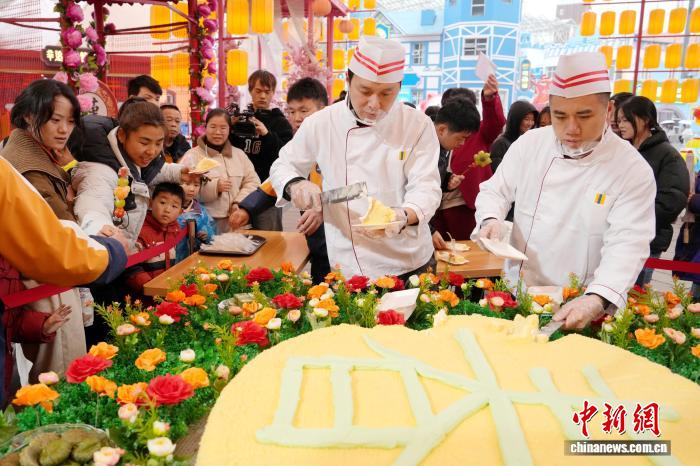 3月8日,长沙世界之窗景区,工作人员把巨型春饼免费分发给游客食用。杨华峰 摄