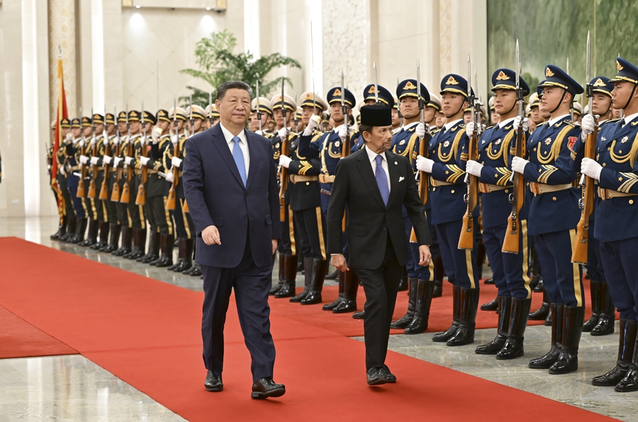 2月6日上午,国家主席习近平在北京人民大会堂同来华进行国事访问的文莱苏丹哈桑纳尔举行会谈。这是会谈前,习近平在人民大会堂北大厅为哈桑纳尔举行欢迎仪式。新华社记者 黄敬文 摄