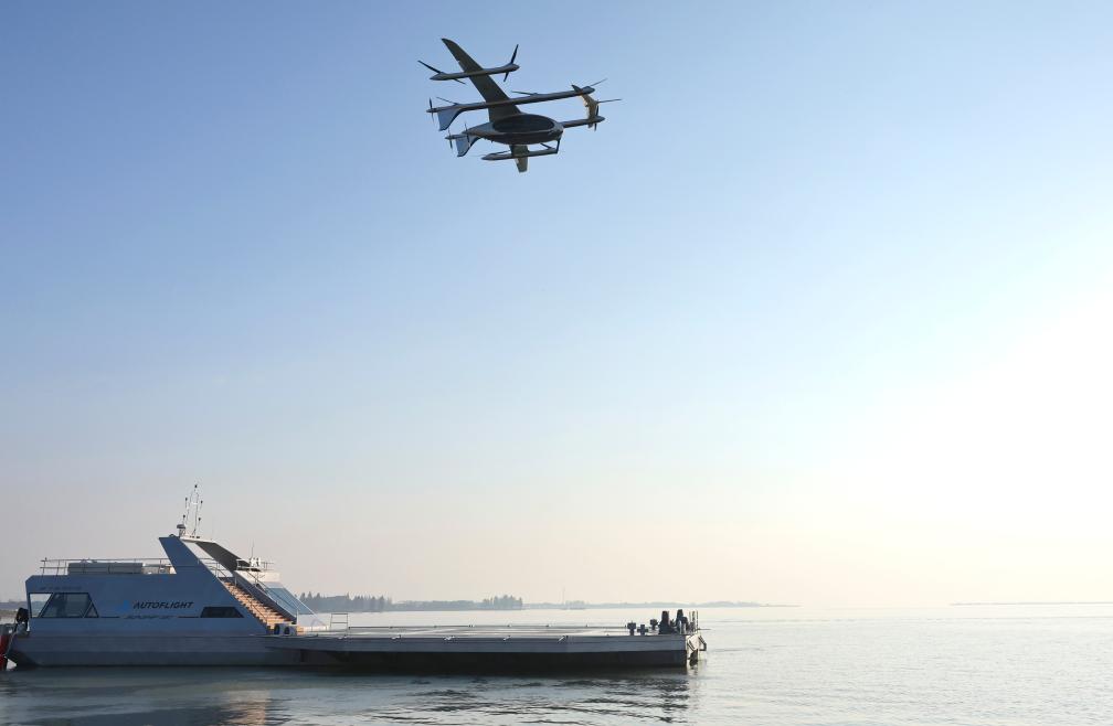 2025年11月22日,在江苏昆山的峰飞航空全球科技日活动中,一架电动垂直起降飞行器从“水上机场”起飞。新华社记者 方喆 摄