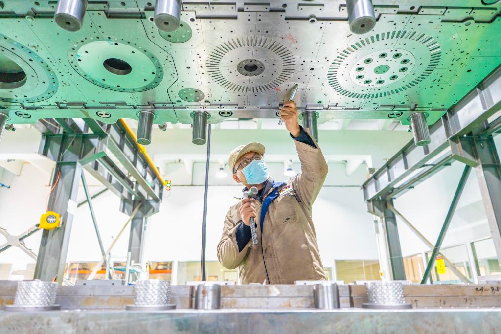 2025年12月15日,在位于江苏省南通市通州区兴仁镇的江苏富松模具科技有限公司车间内,工人赶制模具产品订单。新华社发(翟慧勇摄)