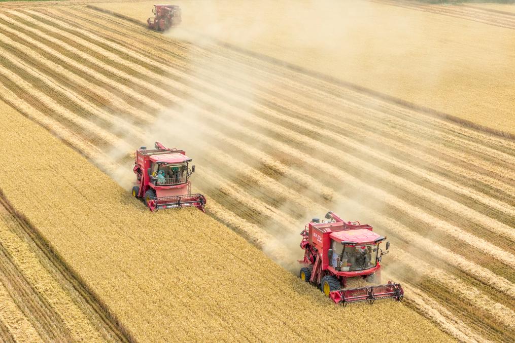 2025年6月9日,河南省三门峡灵宝市西阎乡东古驿村村民在抢收小麦(无人机照片)。新华社发(杜杰摄)