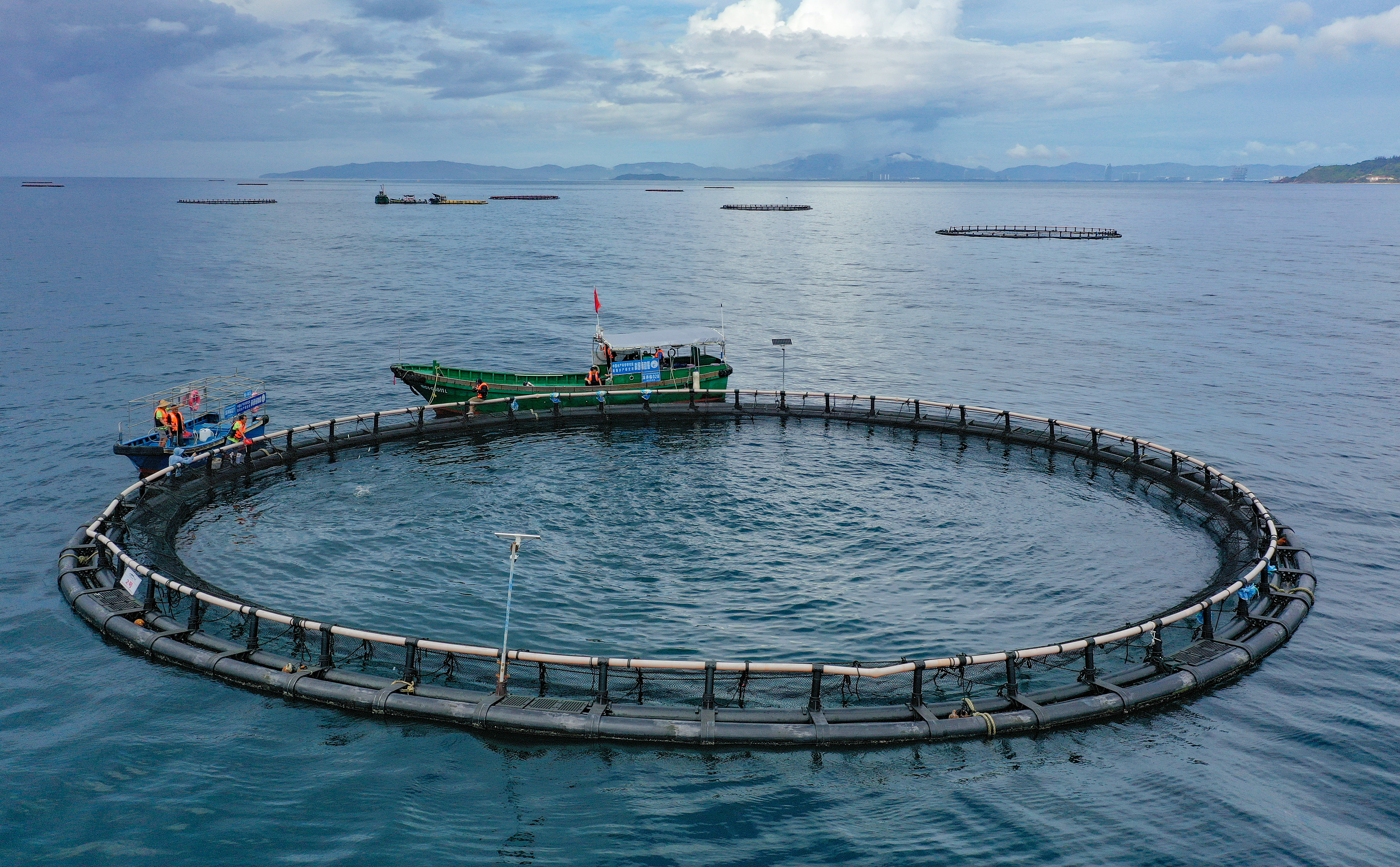 陵水黄鳍金枪鱼海上养殖示范基地,依托南海天然暖流与纯净水质,构建起集育苗、驯化、养殖于一体的现代化海洋牧场,填补了我国高端金枪鱼养殖空白。新华社记者 郭程∕摄