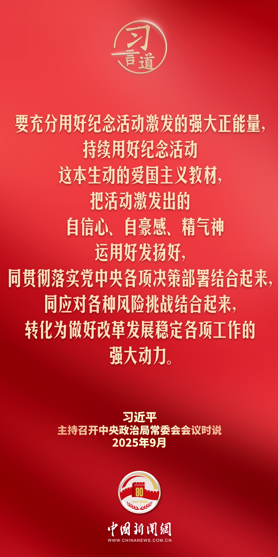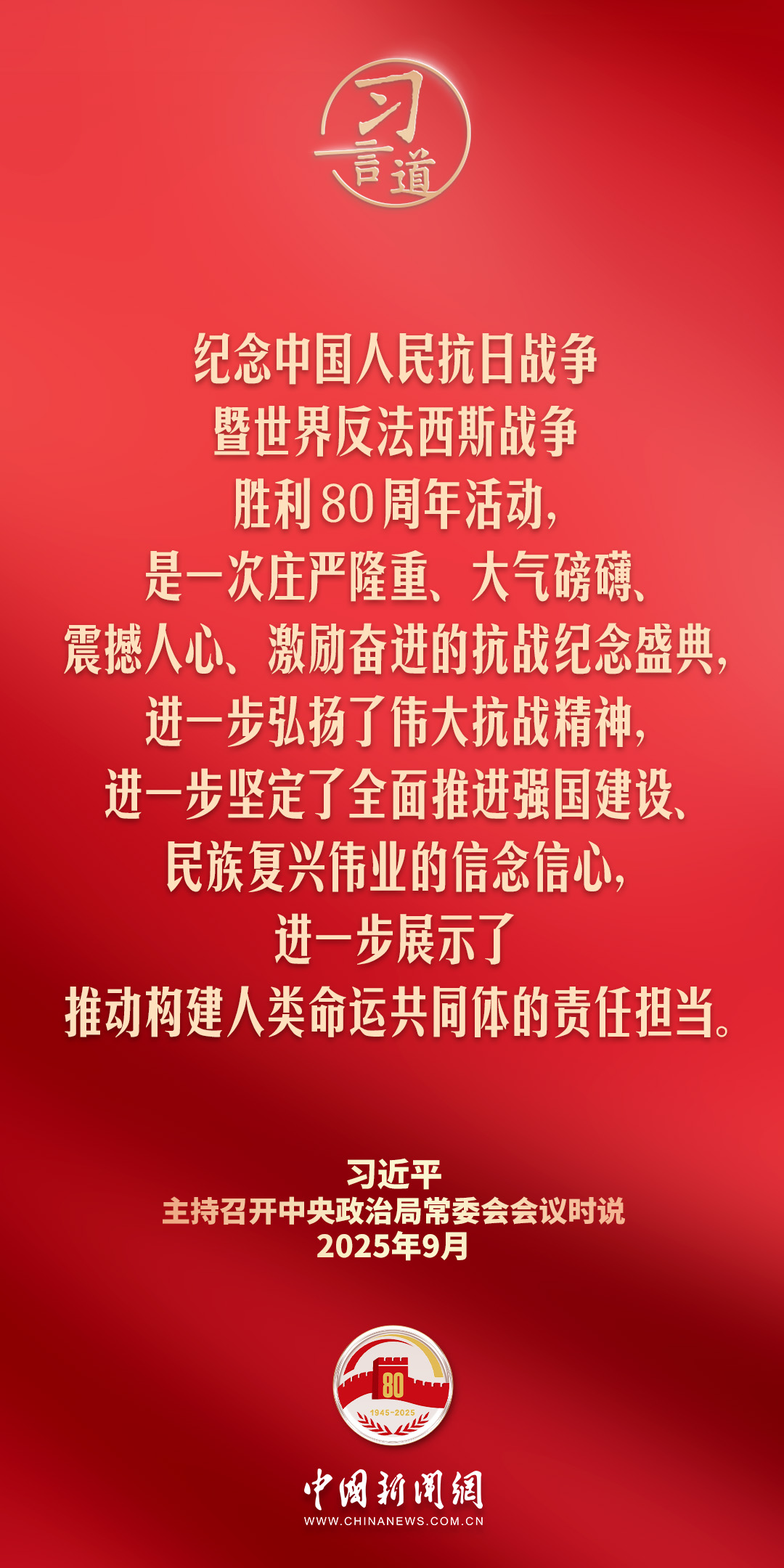 中国人民抗日战争暨世界反法西斯战争胜利80周年纪念活动总结会议17日举行,中共中央总书记、国家主席、中央军委主席习近平在人民大会堂亲切接见纪念活动筹办工作各方面代表。日前,习近平主持召开中央政治局常委会会议,专门听取纪念活动总结报告并发表重要讲话,习近平指出——