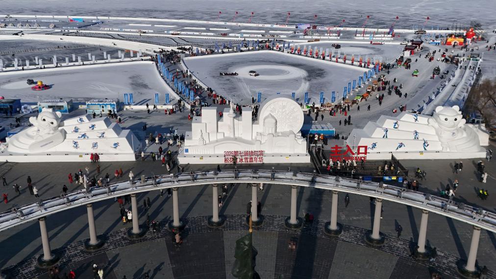 这是1月8日在哈尔滨道里区的防洪纪念塔广场拍摄的亚冬会吉祥物雪雕“滨滨”和“妮妮”(无人机照片)。新华社记者 王松 摄