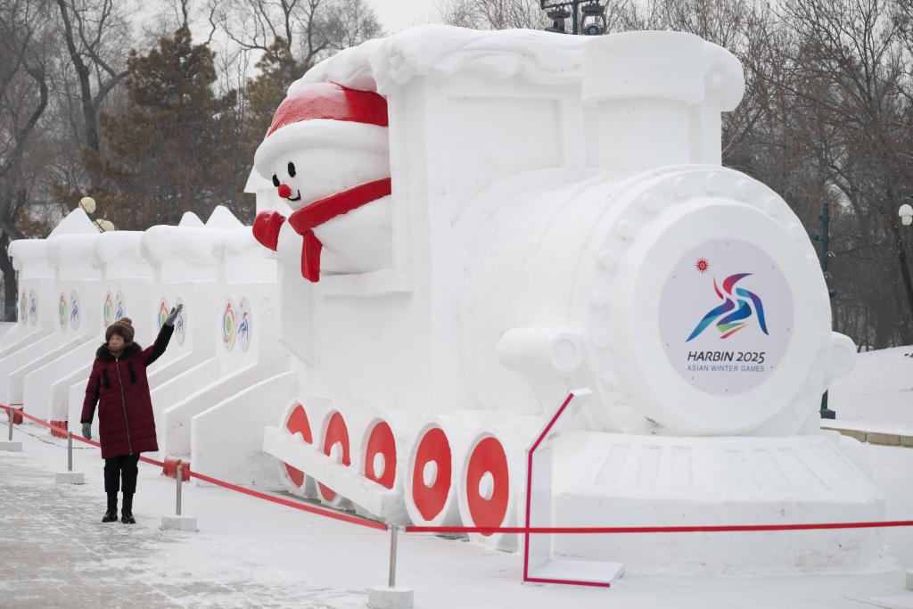 1月7日,在哈尔滨太阳岛雪博会园区,游客与“亚冬列车”雪雕合影。新华社记者 张涛 摄
