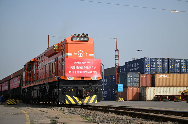 2025年首列天津港经霍尔果斯直达塔什干的中亚班列从天津港物捷三堆场发车(2025年5月20日摄)。新华社记者 赵子硕 摄