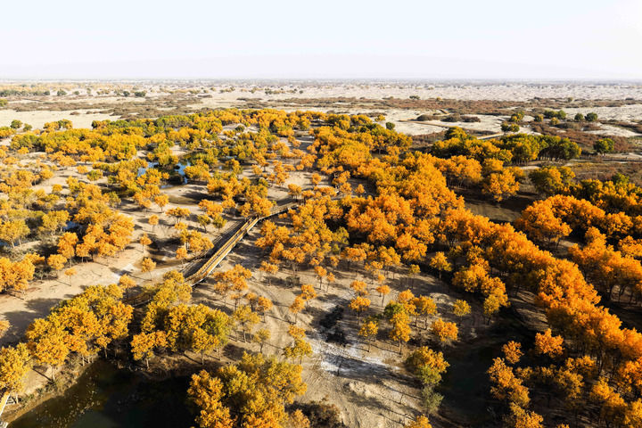 这是2025年10月19日拍摄的新疆和田地区洛浦县洛滨胡杨林景区风光(无人机照片)。新华社记者 辛悦卫 摄