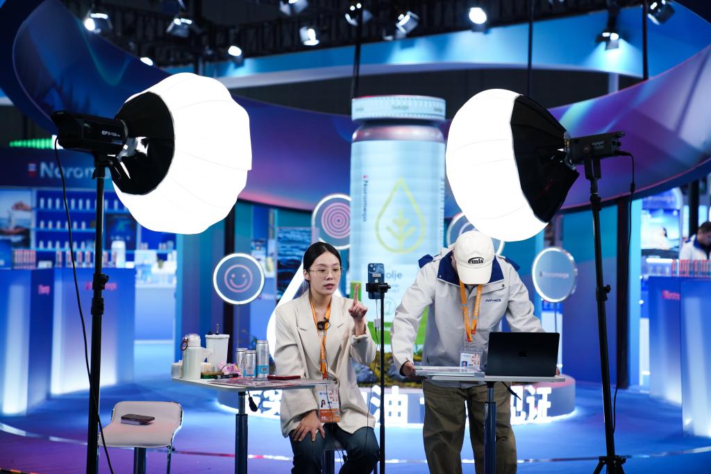 11月4日,工作人员在第八届进博会医疗器械及医药保健展区直播。新华社记者樊雨晴 摄